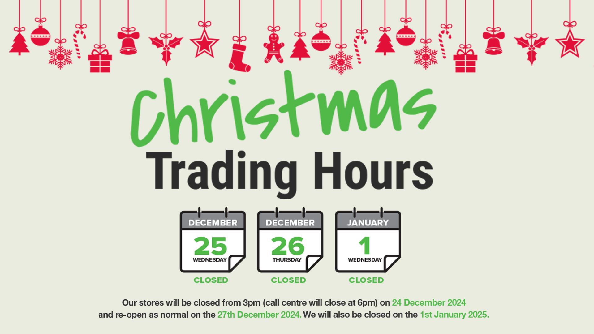 Our stores will be closed from 3pm (call centre closes at 6pm) on Tuesday 24 December 2024 and re-open as normal on 27th December 2024. We will also be closing out stores at 3pm (call centre closes at 6pm) on the 31st December and re-open as normal on 2nd January 2025.