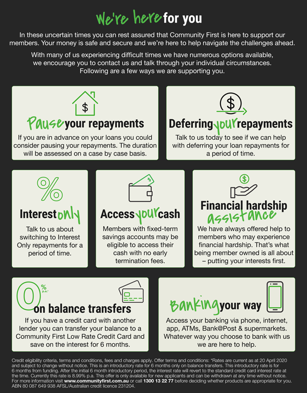 The important thing to remember, is that as a Community First member, you enjoy a variety of options to manage your money without the need to visit a store. Our Australian based contact centre remains open and ready to assist you.